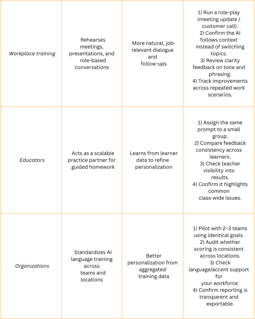 Choosing a platform means knowing exactly which capabilities will support your speaking progress and how they translate into your daily practice.