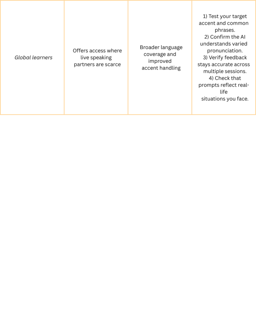 As AI language training continues to improve and adapt to the its demand…choosing tools that prioritize clarity, interaction quality, and measurable progress becomes increasingly important.