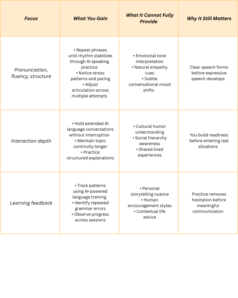 AI language conversations address those gaps by making speaking more frequent or guided, and/or measurable.